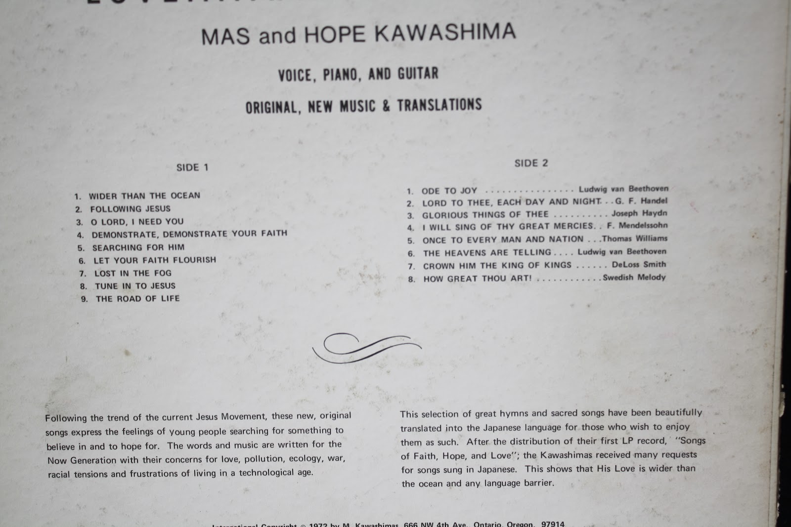 "Love...Wider Than The Ocean" is a 1972 private pressing by Mas & Hope Kawashima, two Japanese-Americans who sing and play their own hymns on side one. This one's ["the Road of Life"] my fave,